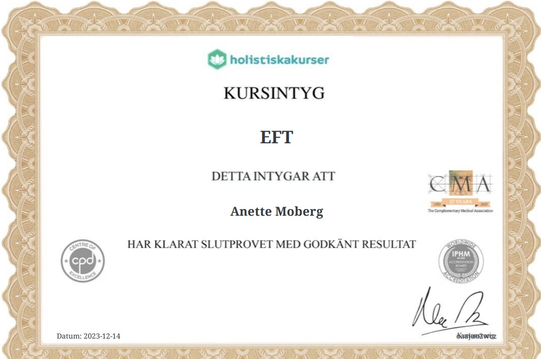 The best thing about the conversations was that I immediately gained confidence in Anette, and I felt that she wished me well. She gave me tools that I could use in a stressful everyday life, and that helped me a lot. The hardest thing was to actually stick to the good habit, when you're used to procrastinating. I learned the importance of being grateful and that it gives strength to write down, and got to work with EFT, which suited me perfectly. I got to try different things, and talk about my difficulties. I will continue with both gratitude journal and EFT. I experience Anette as warm and talented, and that she with care for me and adapted to my person and needs gave me good tools to use to reduce stress and negative thoughts. Thank you so much Anette, you are a gem!